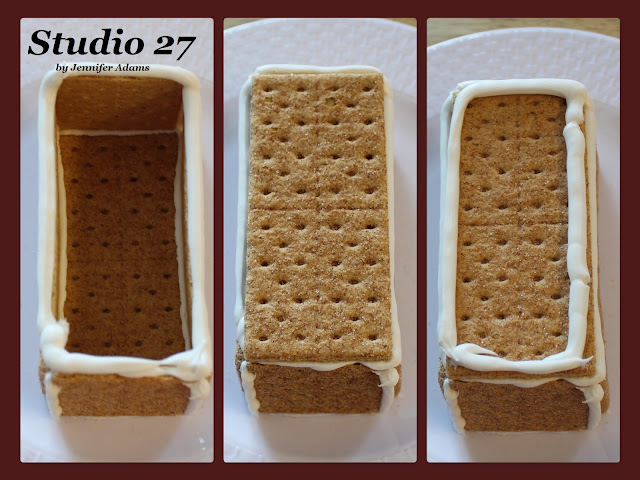 Using a couple more full length crackers, stick them to the sides of the base cracker to create the long walls. Break another cracker in half to fill in the end gaps.