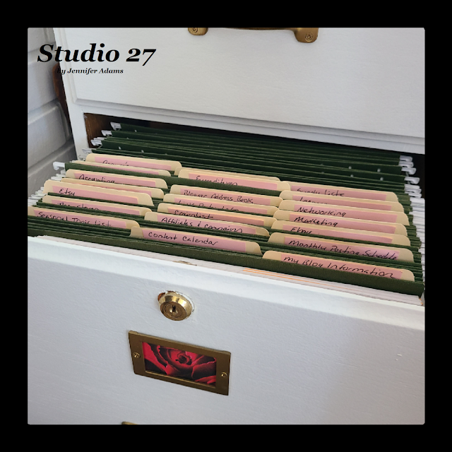 Next to my desk table is a large file cabinet.  A thrift store purchase, I repainted the body in white and sprayed the hardware gold.  Instead of labels in the name plates, I added a bit of my rose printed scrapbook paper.