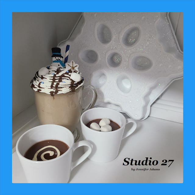 The resin cocoas were made like this and the spackle cocoa like this. The cake pan I spray painted in white, sprinkled with glitter and then sealed.